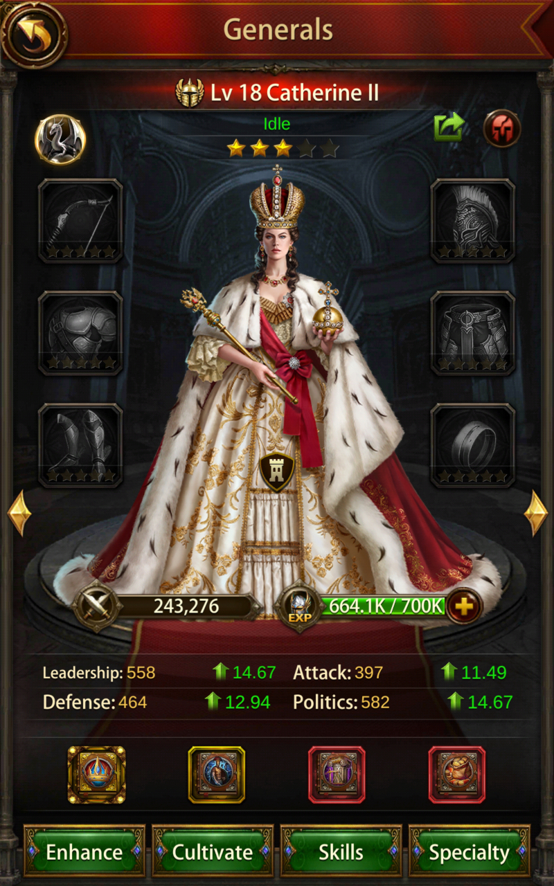 To be clear: I am NOT recommending using Catherine II as a peace time mayor. I am recommending that, if you can ascend her, she be used as a [PvP] mayor. There are a other generals that, like her, appear on the surface to be peace time mayors, but have hidden PvP potential. The reader will need to evaluate these mayors as and against other PvP mayors on the strength of these [PvP] [buffs].
